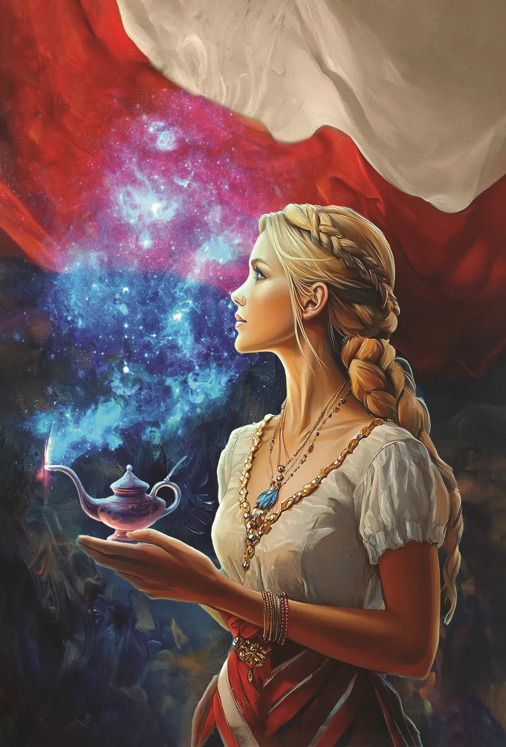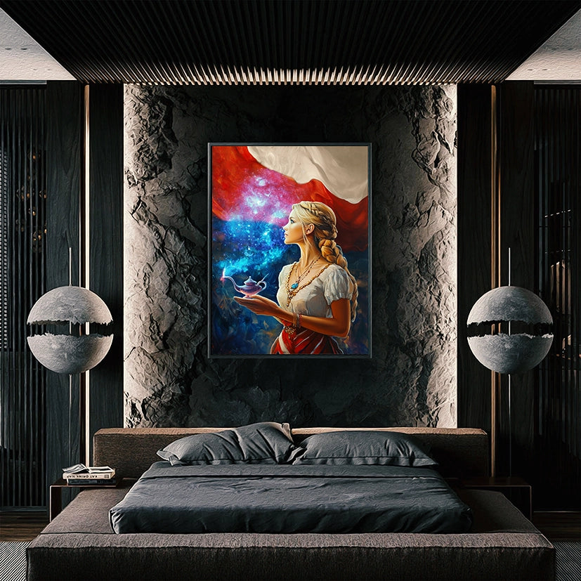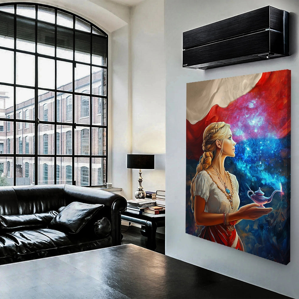 Wyrazisty obraz na płótnie (Canvas) w stylu modern art. Profil dziewczyny w ludowym akcencie trzymającej magiczną lampę, nad którą rozświetla się galaktyczny dym na tle biało-czerwonej flagi. Idealny do salonu, sypialni, gabinetu i wnętrz loft/modern. Dostępny w wersji kolor i czarno-białej.