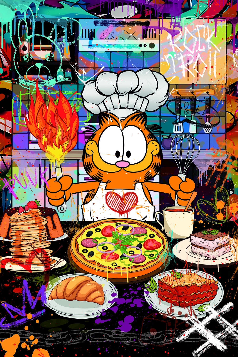 „Kot Szef Kuchni – kuchnia Pop Art ” to energetyczny obraz na płótnie (Canvas) łączący pop art i street art. Rudy kot w czapie kucharskiej, pizza, naleśniki, croissant i lasagne na tle kolorowych graffiti – idealny akcent do kuchni, jadalni, kawiarni i nowoczesnych loftów. Druk HD na płótnie premium, gotowy do powieszenia.