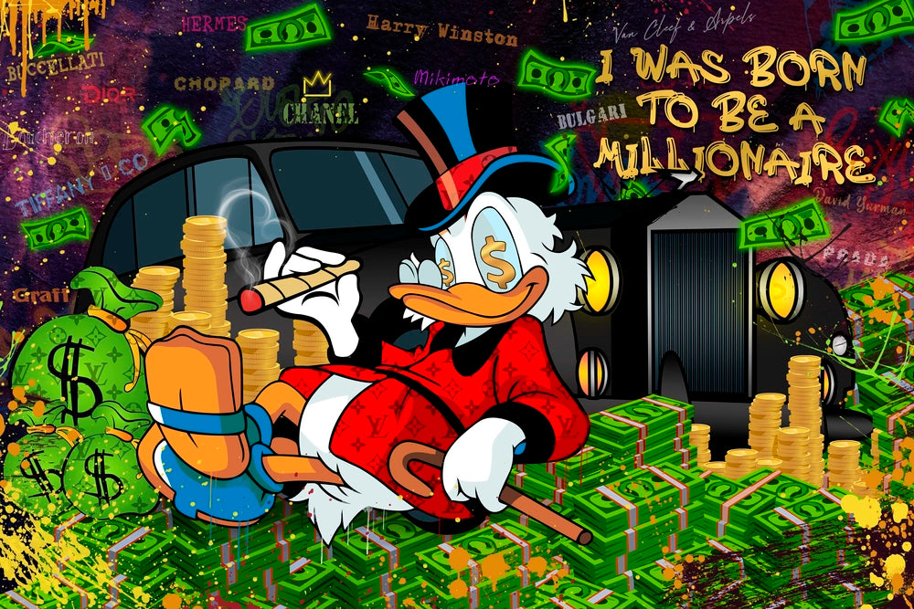 Ta praca na płótnie przedstawia dynamiczny i barwny obraz, nawiązujący do stylu POP ART. Głównym bohaterem jest popularna postać Kaczora Sknerusa, który zrelaksowany siedzi na stosie pieniędzy przed luksusowym samochodem. Wokół niego znajduje się mnóstwo złotych monet, zielonych banknotów oraz worków z pieniędzmi. Sknerus ubrany jest w czerwony, elegancki strój z luksusowym wzorem i trzyma cygaro, co podkreśla jego bogactwo i status.