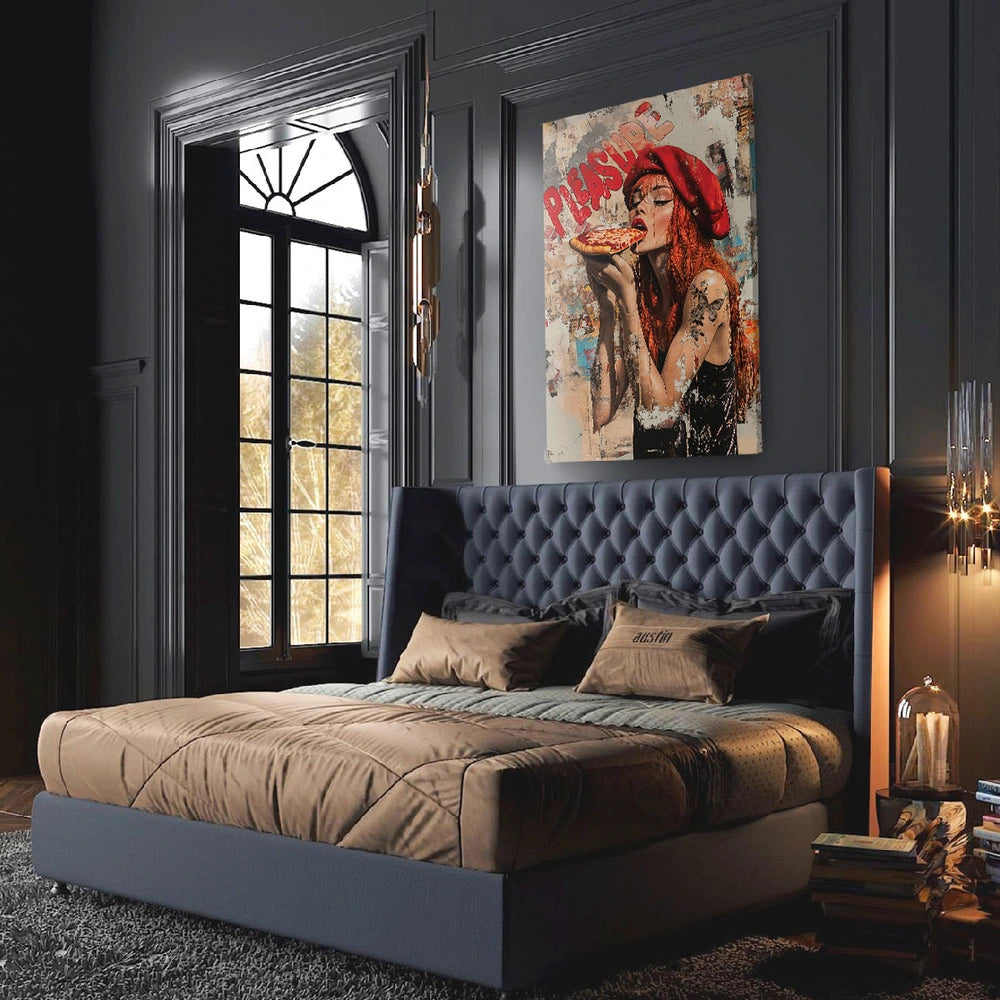 Dodaj wnętrzu charakteru i energii. „Pizza girl” łączy estetykę pop artu z miejską surowością street art. Dynamiczne, warstwowe tło i typografia „PLEASURE” podkreślają vibe plakatu, a zmysłowy kadr z pizzą buduje klimat lifestyle/fashion.