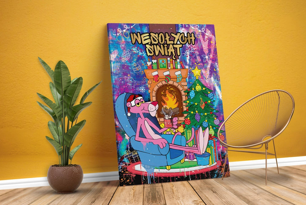 Podkręć świąteczną atmosferę sztuką, która wywołuje uśmiech. Ten Canvas łączy kultową postać, Różowej Pantery z żywym, graffiti-owym tłem, ciepłem płonącego kominka i detalami jak bombki, światełka, skarpety i prezenty. Neonowa paleta barw ożywia wnętrze w sekundę – od nowoczesnego salonu, przez pokój dziecka po loft i przestrzeń biurową.